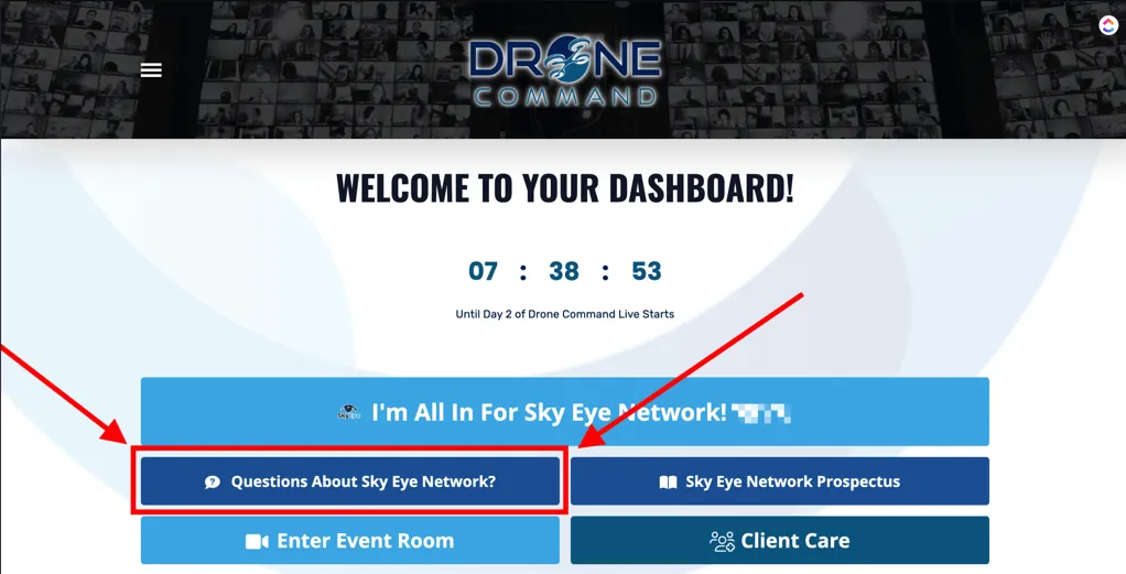 Step 2: Click the link on the Dashboard "Questions About Joining Sky Eye Network?" and you will be able to speak with a Team Member Live on Zoom